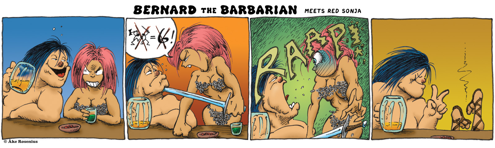 Hey, he defeated her in fair combat. Plain open attack from straight up front. Bernard's first cameo guest appearance (there will be many more) is, unfortunately, kind of crappy. Esteban Maroto's classic Sonja outfit has a well established design with armor made of round metal scales, ornate shoulder protectors, gloves, boots and various ornaments; here she's just wearing a generic bikini of second-rate chainmail. I got much more particular with accurate portrayals of guest characters later. Again, apologies for the Swedish sound effect. Turning ”RAAP” into ”BUURP” in a flat image without layers just didn't seem worth the bother. Sonja's word balloon is one of two versions that I drew. The one that did end up in the strip – saying ”six” for ’sex’, same word in Swedish – got used although I wasn't too sure about the potentially confusing double negation; no fighting = no sex. Still, I picked it since the other (below) could be read as meaning there will be sex as long as they have a fight first. The hassles of wordless writing.