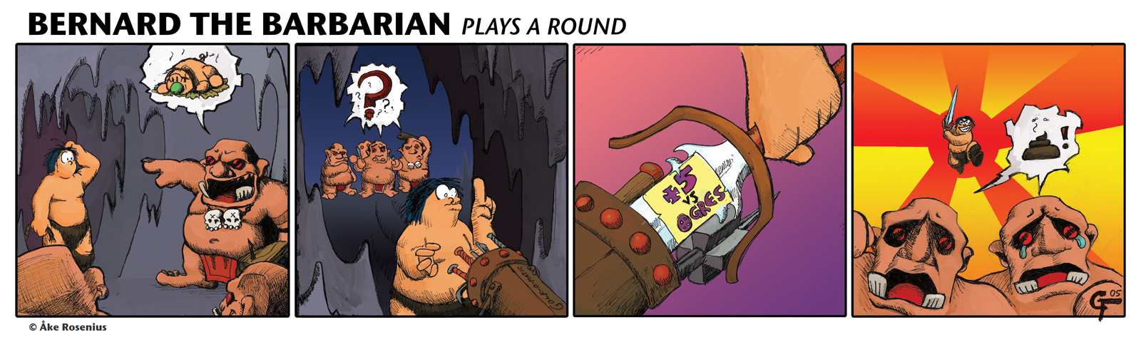 Story: Magnus Seter Golf-O-Matic! The second of three deputy strips, again penned by Magnus. Love the ogre in the 2nd panel who's already holding a fork and knife… Gabriel later decided that comics weren't his thing, but he went on to work as a 3D artist for a videogame company so he stayed in the creative business.