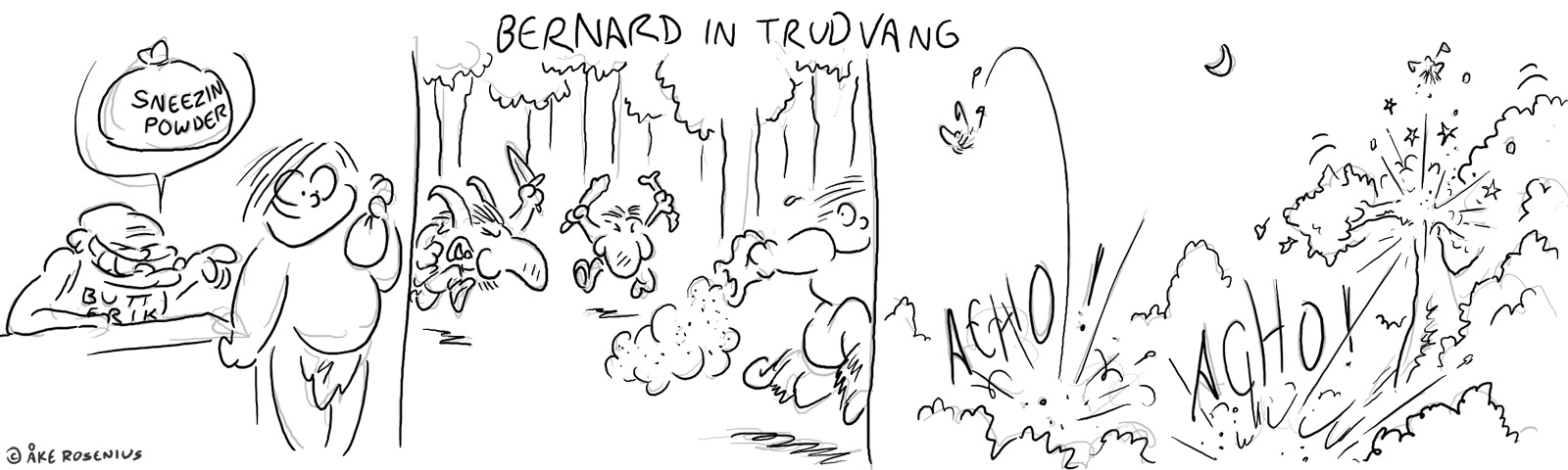 Trudvang is originally the name of a part of Asgard; Thor is a Trudvanger. Trudvangite. In this context it's a world setting for the Swedish role-playing game Drakar och Demoner (”Dragons and Demons”; not the same game as Dungeons & Dragons). One of Trudvang's visual hallmarks is its fairy tale inspired trolls with their… prominent noses. I scrapped the idea because I had finally learned not to base my strips on internal humor for Swedish tabletop gamers. Another local reference – the sneezing powder salesman has a tish with the text ”Butt Erik”. Sweden's most well-known store of party novelties is called Butterick's. The Dark and Hairy Annals of Birger Barbaren |
