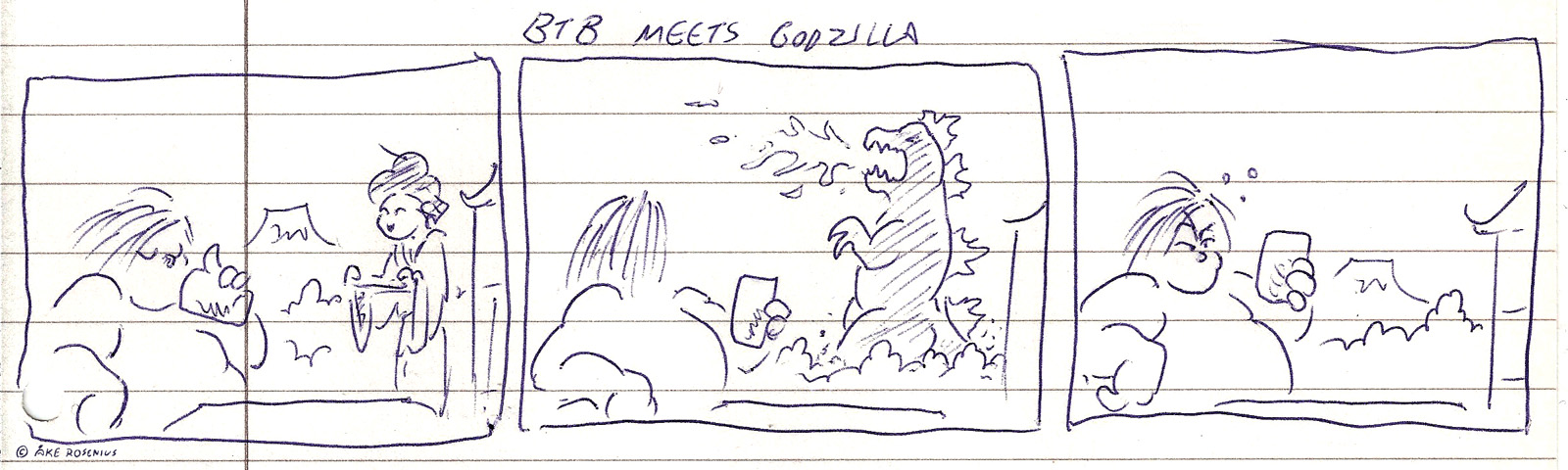 Rejected this because the joke was pretty crappy, and Godzilla had already appeared (albeit out of picture) in another strip that will be uploaded here eventually. He then turned up yet again in a much later strip, but never mind. In hindsight, it may also have been a factor that Godzilla looks terribly bland in this sketch. If he'd turned out more cool looking I might have been inspired to give the idea another go. The Dark and Hairy Annals of Birger Barbaren |