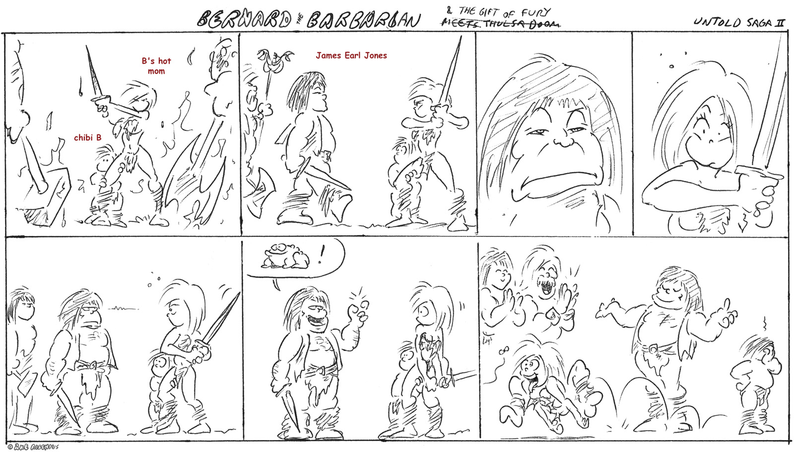 Last but not least… That's Thulsa Doom, Rexor and Thorgrim reprising a scene from Conan the Barbarian (1982). The problem here was that the joke didn't really stand on its own feet; it was a direct add-on to the ’BtB – the Untold Saga’ comic, which had only been published in Bernard's compilation book, so it wasn't all that usable in Fenix. Someone pointed out that if we take this as canon, Bernard's mother is apparently not dead, just hypnotized. She's probably still sitting by a pond somewhere eating flies.