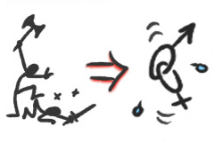Hey, he defeated her in fair combat. Plain open attack from straight up front. Bernard's first cameo guest appearance (there will be many more) is, unfortunately, kind of crappy. Esteban Maroto's classic Sonja outfit has a well established design with armor made of round metal scales, ornate shoulder protectors, gloves, boots and various ornaments; here she's just wearing a generic bikini of second-rate chainmail. I got much more particular with accurate portrayals of guest characters later. Again, apologies for the Swedish sound effect. Turning ”RAAP” into ”BUURP” in a flat image without layers just didn't seem worth the bother. Sonja's word balloon is one of two versions that I drew. The one that did end up in the strip – saying ”six” for ’sex’, same word in Swedish – got used although I wasn't too sure about the potentially confusing double negation; no fighting = no sex. Still, I picked it since the other (below) could be read as meaning there will be sex as long as they have a fight first. The hassles of wordless writing.