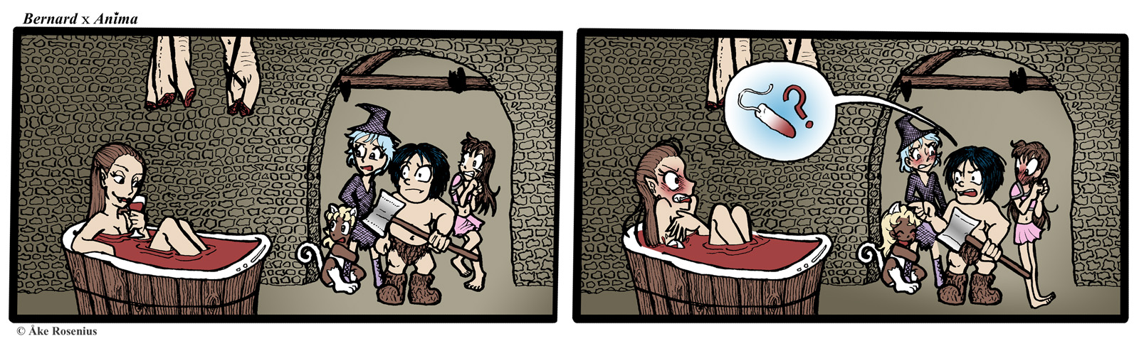 Story & art: Stef Gaines It's just a simple question… Stef, an active figure in the Swedish indie comics scene and former chairman of the Swedish Comics Association, gets to start off these guest strips with a hilarious piece that ties in with her own self-published comic Anima. Big fan of that one. The other characters, though somewhat Bernard-ified here, are all from Anima – Mikaela (pink skirt; the main protagonist), Zako (blue hair), Cat (the, eh, cat) and our bathing beauty, Countess Arsébeth Báthory. Btw, do take a moment to appreciate the masonry. The Dark and Hairy Annals of Birger Barbaren |