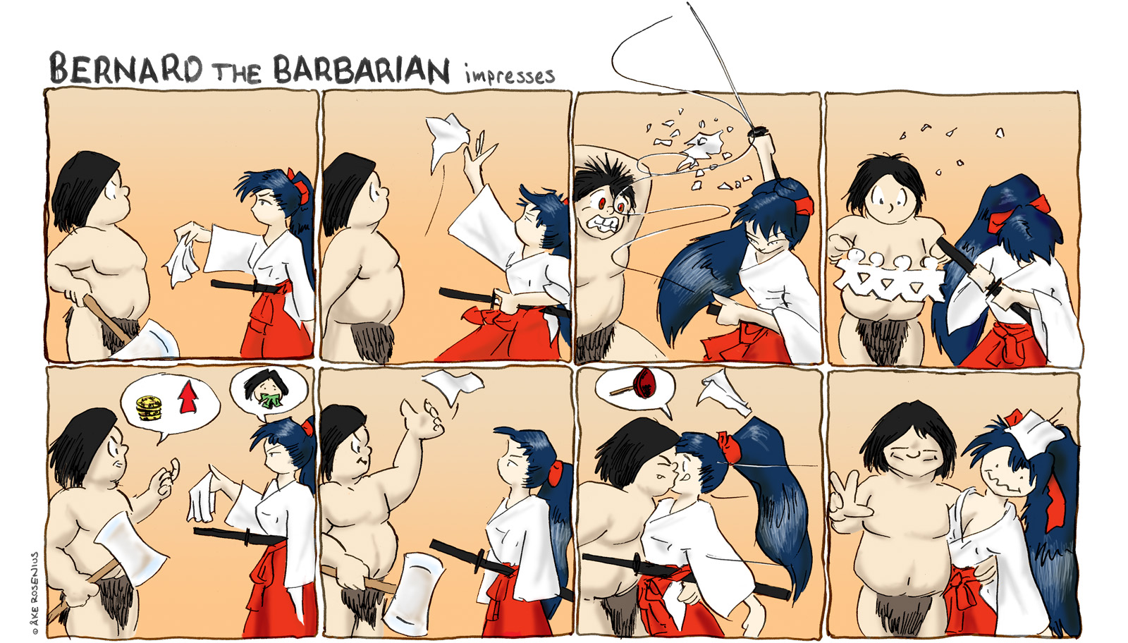 Story & art: Krister Sundelin Watch it where you swing that sword, lady – you're way outside the panel. Krister is a lauded veteran in the self-published tabletop RPG genre, and I've featured a few of his creations in my own Bernard strips. The girl getting a surprise smacker here is Fujiko Kinohara, an NPC from Krister's game Andra imperiet (”The Second Empire”). The Dark and Hairy Annals of Birger Barbaren |