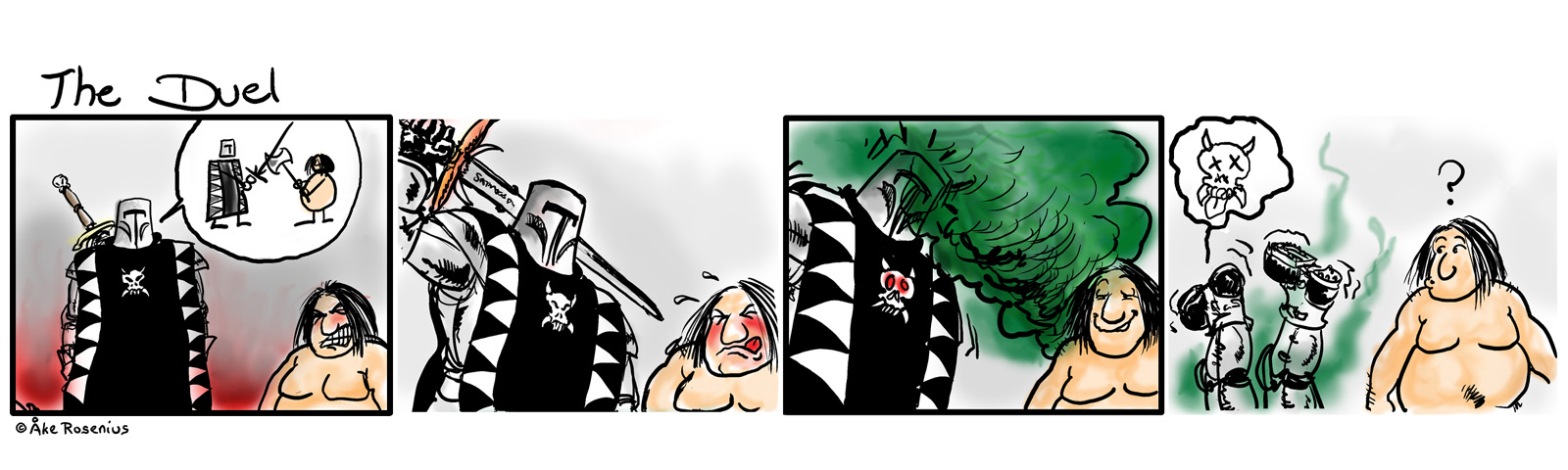 Story & art: Daniel Björk As I said, stay upwind… Another outing from Daniel. The big mean guy is The Black Knight from his non-worksafe webcomic Sam the Black Knight. BTW the panels in his two strips were originally set vertically, Japanese 4-koma style. It wouldn't fit into a page layout made for horizontal strips (in the compilation book) so I had to rearrange them. This one ended up only appearing on the Fenix site and not in the book, but I chose to leave it the same way as the other strip for consistency. Fenix website |