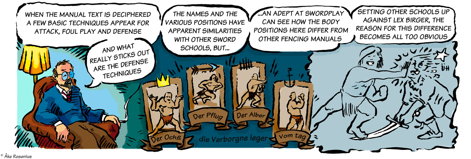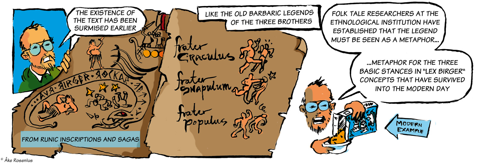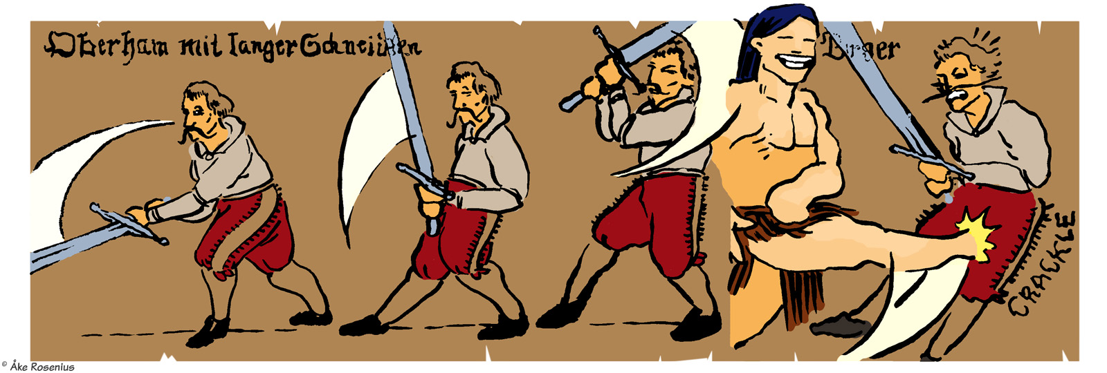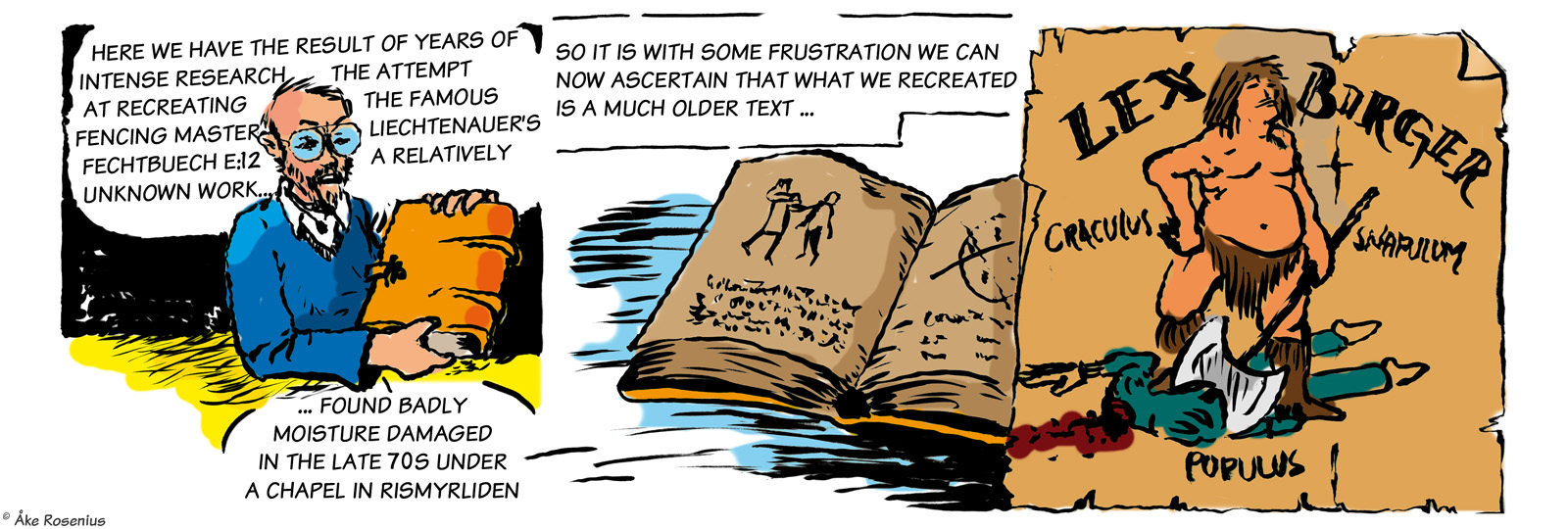 Story & art: Jonas ’Isegrim’ Lidström And now for something completely different… By far the longest, and weirdest (in a good way), take on Bernard the Barbarian that anyone has drawn. The full piece consists of 11 strips, including three optional ”extras” – 3rd to 5th strips below – plus a trading card. The first strip was included in Bernard's compilation book while the rest appeared on the Fenix website. The word balloons and text boxes are translated from Swedish, but I didn't want to mess around with handwritten in-picture texts unless it was really needed; hence it's ”Lex Birger” and not ”Lex Bernard”. His name turns up in a few places; the runic text in the 6th strip says ”our Birger rocking phat” (more freely, ”our Birger is the shit”). Anything that's in German and stuff has been left untouched. I do recommend taking a moment to check out all the little details in these strips, there's plenty to discover there. For context, the comic is based on the real but somewhat obscure literary subculture around the many European fencing manuals that were produced in the late Middle Ages. (Fencing master Liechtenauer is a real historical figure.) ”Craculus, snapulum, populus” is of course a reference to Snap, Crackle and Pop of Kellogg's Rice Krispies fame. The Dark and Hairy Annals of Birger Barbaren (strip #1 only) |