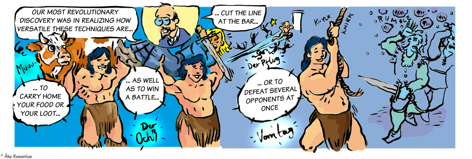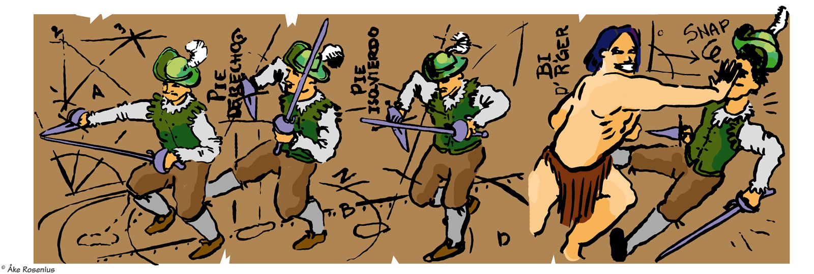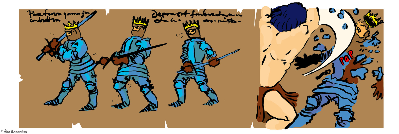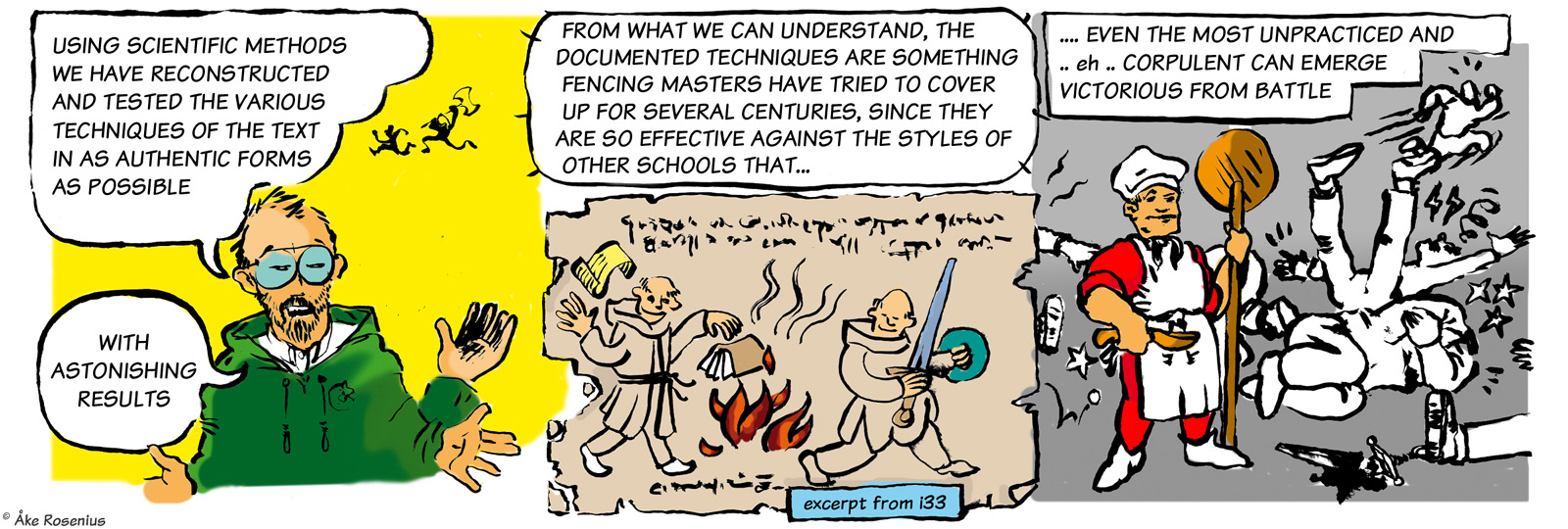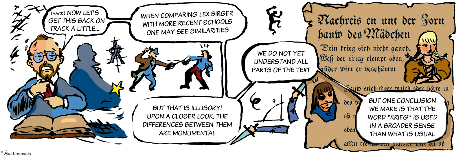 Story & art: Jonas ’Isegrim’ Lidström And now for something completely different… By far the longest, and weirdest (in a good way), take on Bernard the Barbarian that anyone has drawn. The full piece consists of 11 strips, including three optional ”extras” – 3rd to 5th strips below – plus a trading card. The first strip was included in Bernard's compilation book while the rest appeared on the Fenix website. The word balloons and text boxes are translated from Swedish, but I didn't want to mess around with handwritten in-picture texts unless it was really needed; hence it's ”Lex Birger” and not ”Lex Bernard”. His name turns up in a few places; the runic text in the 6th strip says ”our Birger rocking phat” (more freely, ”our Birger is the shit”). Anything that's in German and stuff has been left untouched. I do recommend taking a moment to check out all the little details in these strips, there's plenty to discover there. For context, the comic is based on the real but somewhat obscure literary subculture around the many European fencing manuals that were produced in the late Middle Ages. (Fencing master Liechtenauer is a real historical figure.) ”Craculus, snapulum, populus” is of course a reference to Snap, Crackle and Pop of Kellogg's Rice Krispies fame. The Dark and Hairy Annals of Birger Barbaren (strip #1 only) |