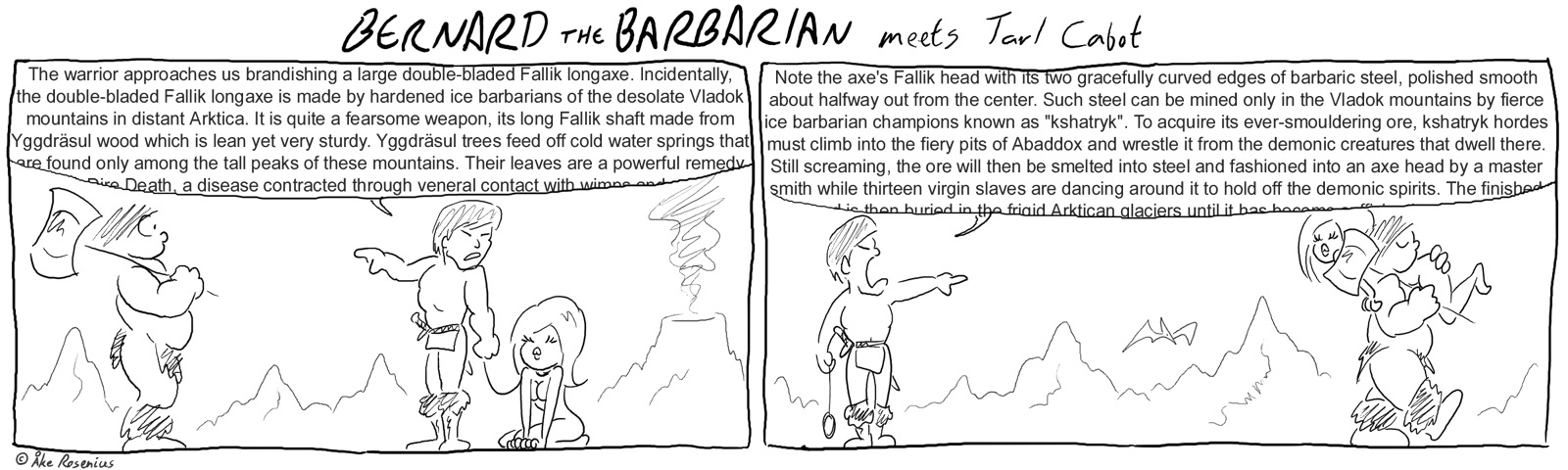 ”Incidentally, that girl is my property and your theft of her would get you in trouble should I report it to the authorities. Which I will not, because Gor is a harsh, cruel world and a man who does not defend his property does not deserve to keep it. Which I did not, so I do not. Incidentally, I am now standing here talking to myself.” Tarl Cabot is the main protagonist of John Norman's Gor novels. When not making wooden BDSM dialogue with slave girls, he has an odd habit of breaking the narrative in mid-action (usually with the word ”incidentally”) to go into lengthy academic lectures. Gorean names don't sound quite this silly, though. I scrapped the strip because Cabot is a pretty obscure character, so most readers wouldn't get the reference. Calling it ’BtB of Gor’ would have made it somewhat more accessible but the reader would still need to know about Cabot and his monologues. Incidentally, his first word balloon ends with a Manowar reference (”Dire Death, a disease contracted through venereal contact with wimps and posers”) but the last words disappeared in the cut. The Dark and Hairy Annals of Birger Barbaren |