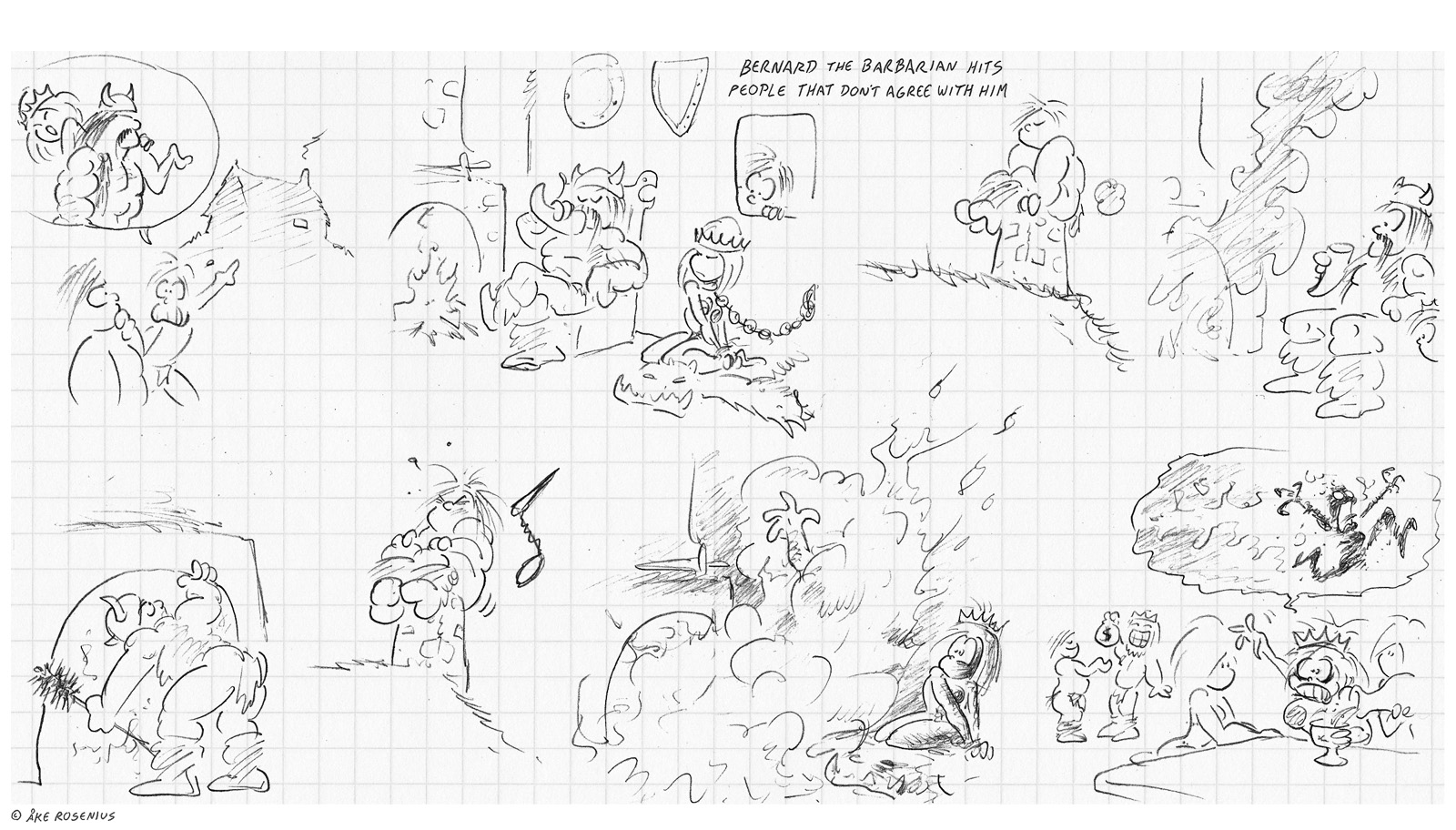 I had to discard this idea because it was just a bit too long. The images are already squeezed in the sketch; to make them fit into two rows in a version with proper panels I would've had to cut them down so much it would affect the storytelling. Bummer, though it's far from the only strip that's been put aside for that reason. The title was added later and has nothing to do with the story. It came about one night when I was half asleep and suddenly the perfect title for a Bernard strip came to me. It was true to character, edgy, clever, spot on… It didn't seem quite as great in the morning. The Dark and Hairy Annals of Birger Barbaren |