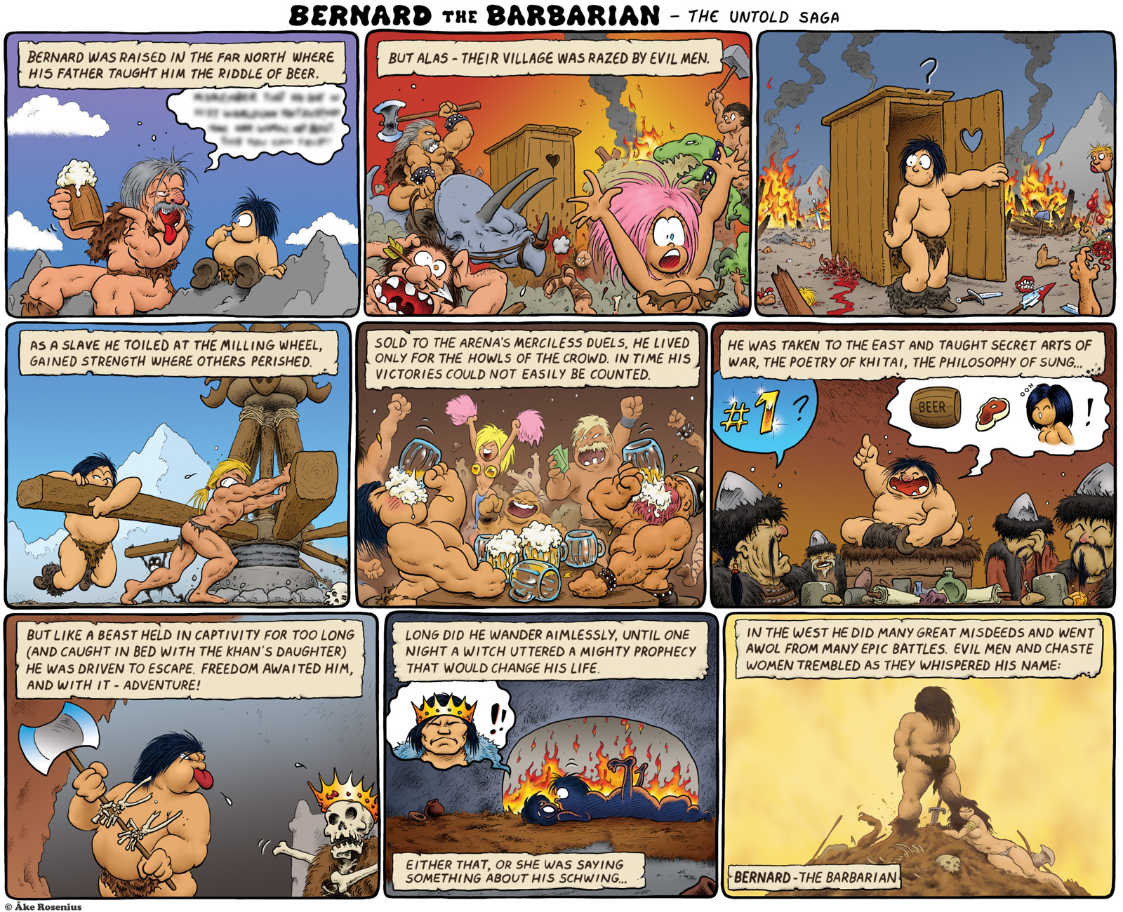 This story shall also be told. Along with a foreword by Peter Bergting, The Untold Saga started off the 2012 compilation book The Dark and Hairy Annals of Birger Barbaren, telling us almost all we need to know about Bernard's character background. (There's also the small matter of the fate of his mom, brought up in a reject strip in the same book.) Of course it's all one big parody of Conan's background in Conan the Barbarian (1982), which should be fairly obvious to anyone who's watched that movie. Apologies for the crappy joke in the second to last panel – the original didn't translate well. In Swedish, ”kung” = king and ”tung” = heavy. So she said something about him being… Shoutout: Some anon made a scanlation of The Untold Saga and posted it on 4chan. I took some inspiration to the above translation from that one so – thanks, anon! The Dark and Hairy Annals of Birger Barbaren |